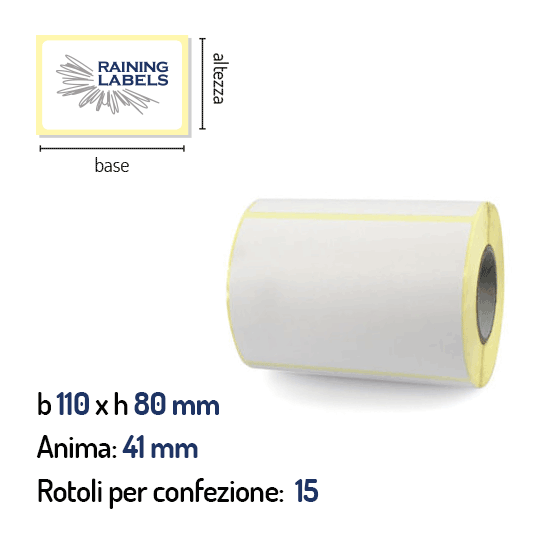 Raining Labels offre ai suoi clienti la possibilità di acquistare anche piccole quantità di rotoli di etichette. È per questo che la nostra confezione da 15 rotoli di etichette a trasferimento termico 110×80 mm è ideale anche per gli utenti finali. Questo tipo di etichette a trasferimento termico si adatta perfettamente a diversi settori di impiego, principalmente nel packaging industriale e commerciale, nei trasporti, nella logistica, nel Retail e nel Fashion.
