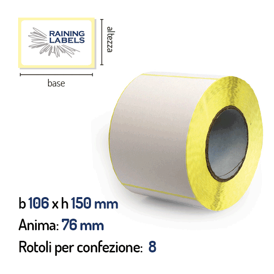 Raining Labels offre ai suoi clienti la possibilità di acquistare anche piccole quantità di rotoli di etichette. È per questo che la nostra confezione da 8 rotoli di etichette a trasferimento termico 106×150 mm è ideale anche per gli utenti finali. Questo tipo di etichette a trasferimento termico si adatta perfettamente a diversi settori di impiego, principalmente nella logistica, Retail, nel Fashion e nel packaging industriale e commerciale.